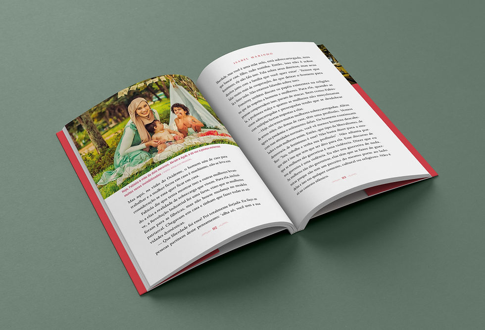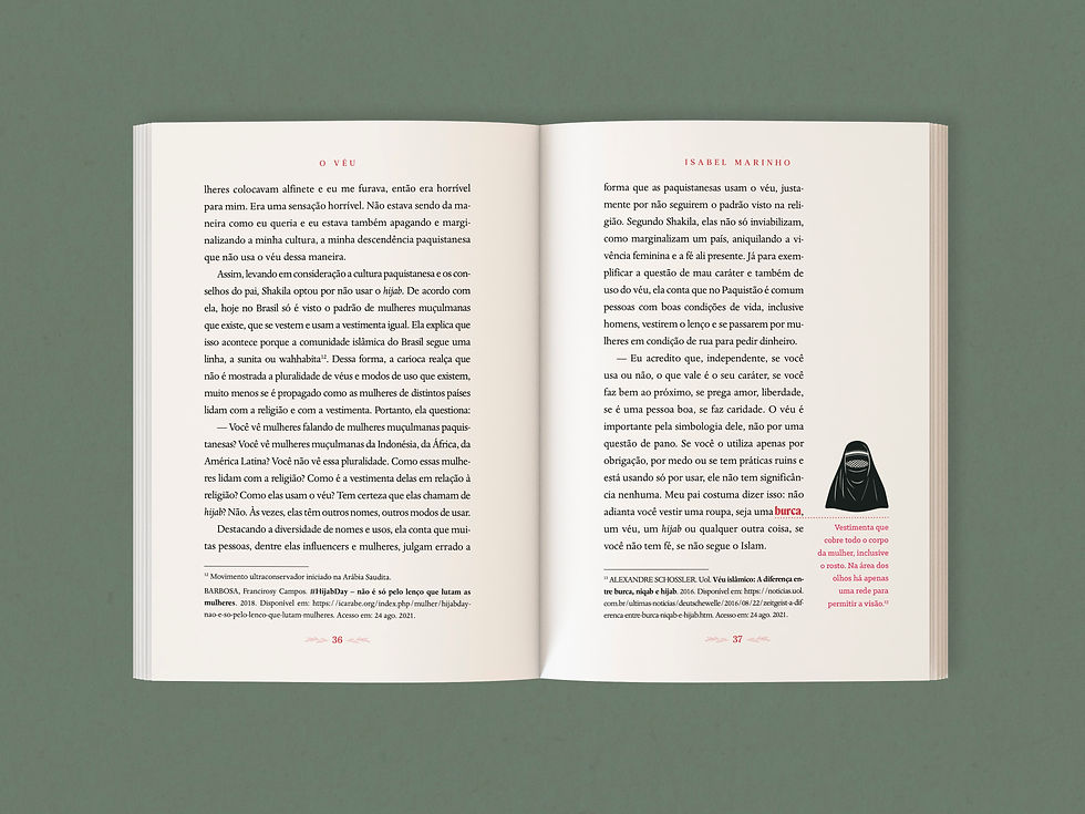 Livro-reportagem sobre cinco mulheres brasileiras, muçulmanas e feministas que defendem, com suas devidas particularidades e vertentes, a possibilidade de conciliação entre a religião islâmica e o feminismo. O projeto gráfico apresenta recursos interativos, como verbetes ilustrados que explicam as diferenças entre os tipos de véus e trazem informações adicionais sobre termos em árabe relacionados ao islamismo.
